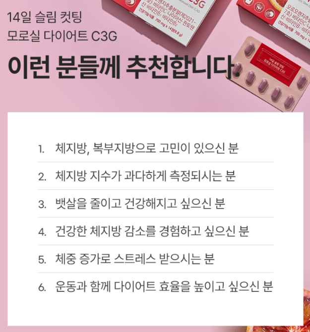 - C3G 성분까지 들어 있어서 지방 연소 + 항산화 효과 동시 케어